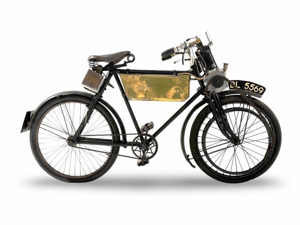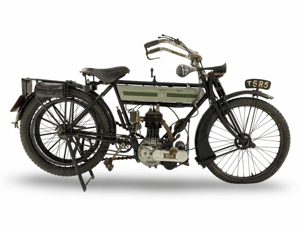 The 1898 MMC Werner 217cc Motocyclette (£7,000–9,000), registration BL 5569, is a rare surviving example with a well-documented history tracing back to its first owner, Walter W. Webber of Webbers, Basingstoke – whose family business supplied cars in the area for over a century. It later passed through the hands of several notable enthusiasts and participated in multiple Pioneer Runs, including Werner’s centenary event in 1998. Restored some years ago by the late father of the current vendor, this is an exceedingly rare opportunity to acquire the great grandfather of todays production motorcycles. Offered from the same collection, the 1912 Triumph 3½hp (£5,000 – 7,000) is equally evocative of the Veteran era and includes a Stewart speedometer and a Sunbeam MCC Pioneer Register plaque.