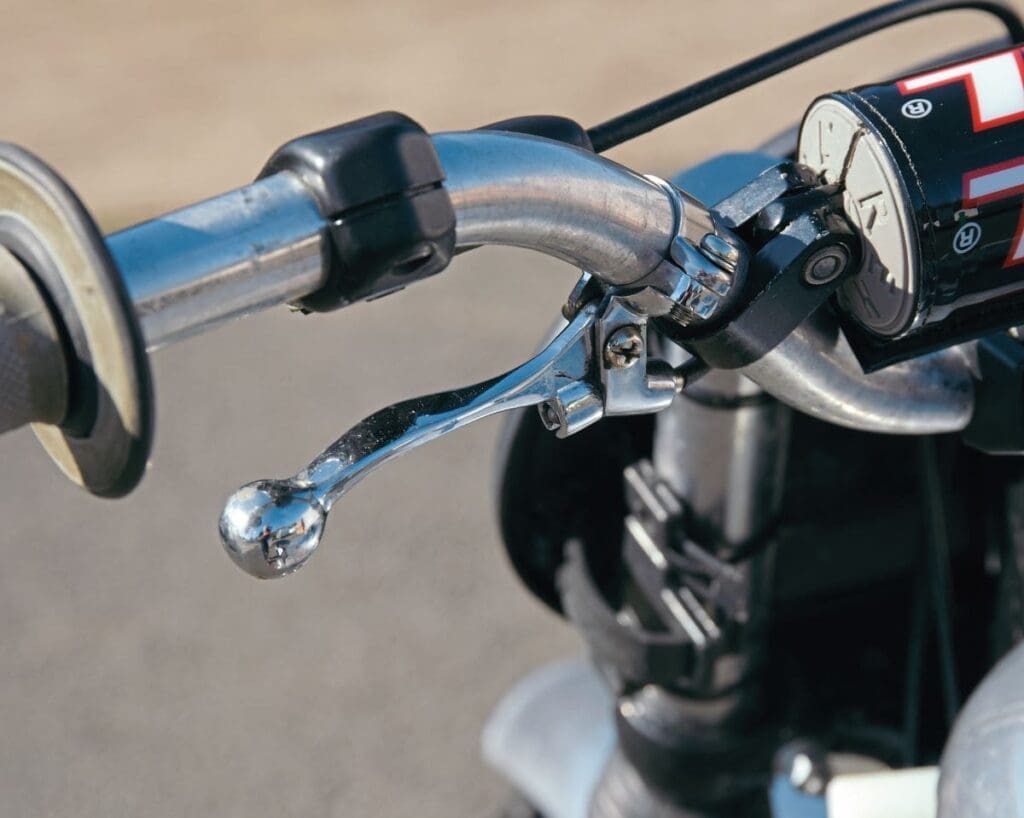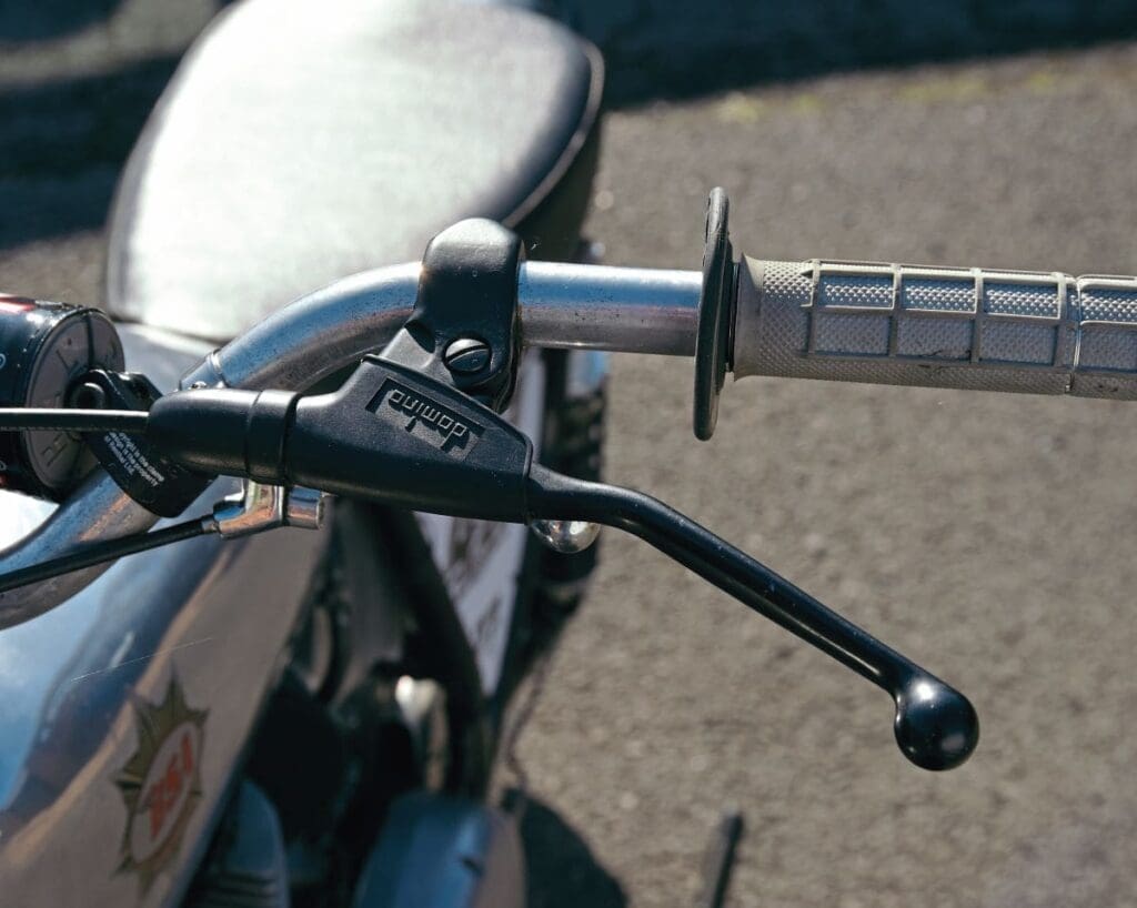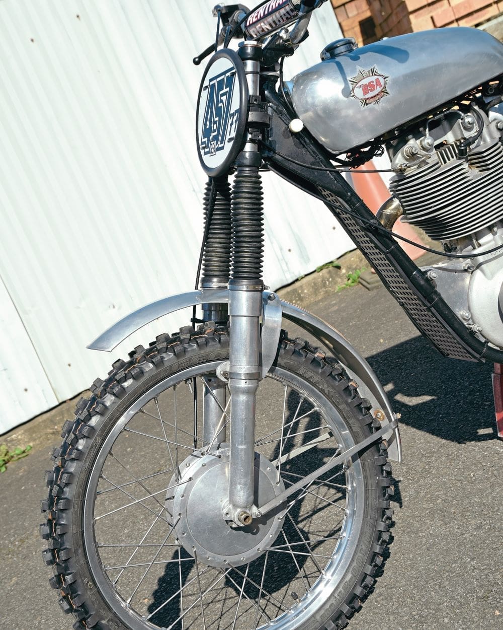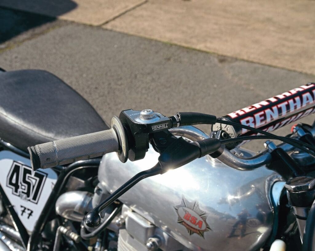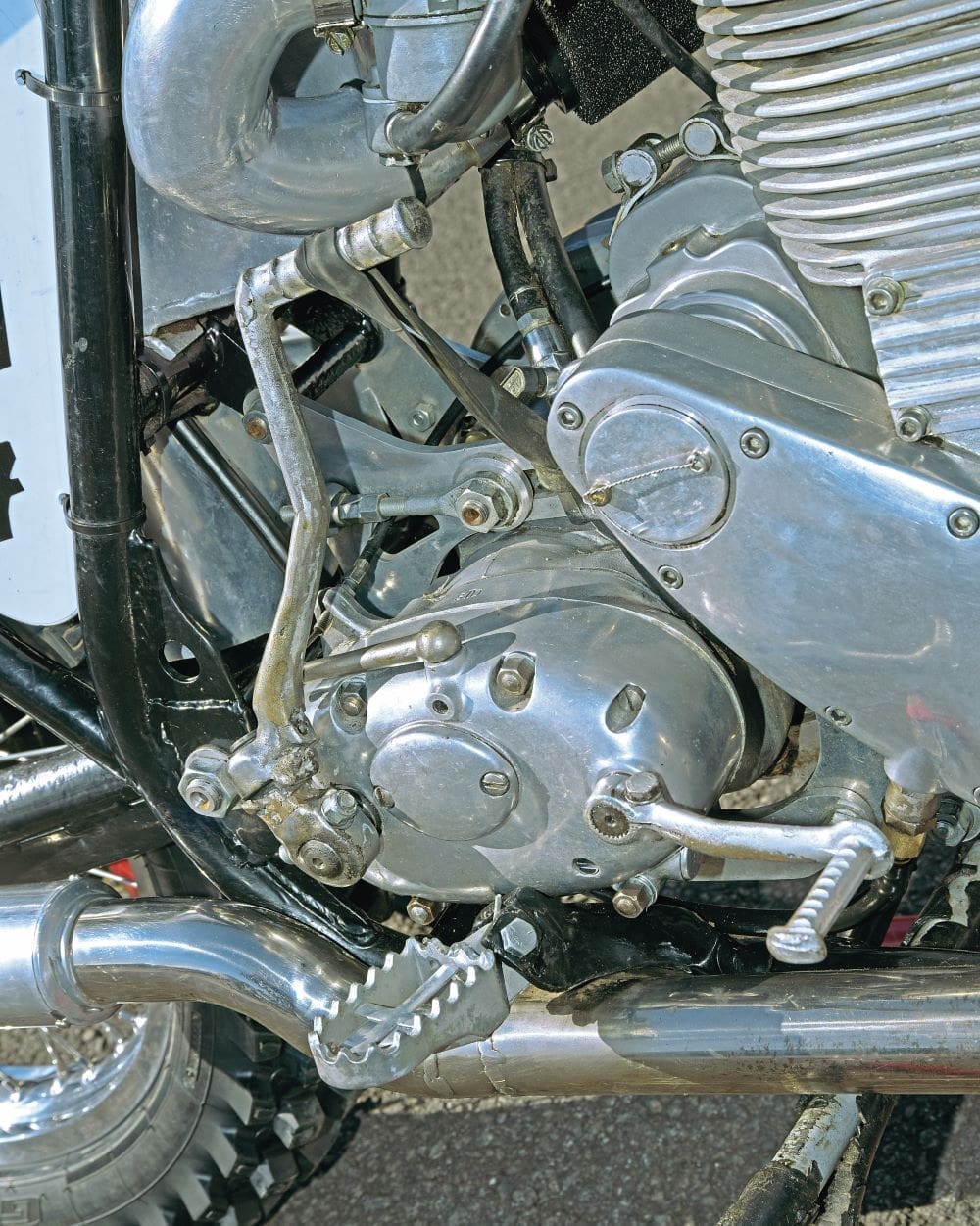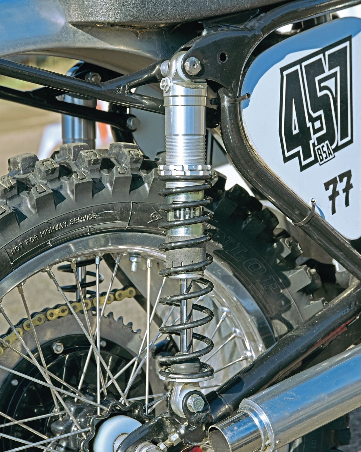 At the other end of the bike sit typical BSA A/B group fork yokes which will take a 35mm diameter stanchion fork from something a bit more modern in the suspension world. These modern forks are slipped into Norton Roadholder sliders, which is pretty much what most people do with this type of motorcycle. BSA would have used cup and cone ball bearings to control the movement of the yokes but, as Harold points out, they’re not really up to the stresses and strains of scrambling and SRM supplies a taper roller steering head kit which does the job. These last couple of sentences have glibly glossed over the amount of effort needed to make such suspension work properly but the attention to detail is needed and pays off too as the front suspension works loads better than the original, yet still looks period.