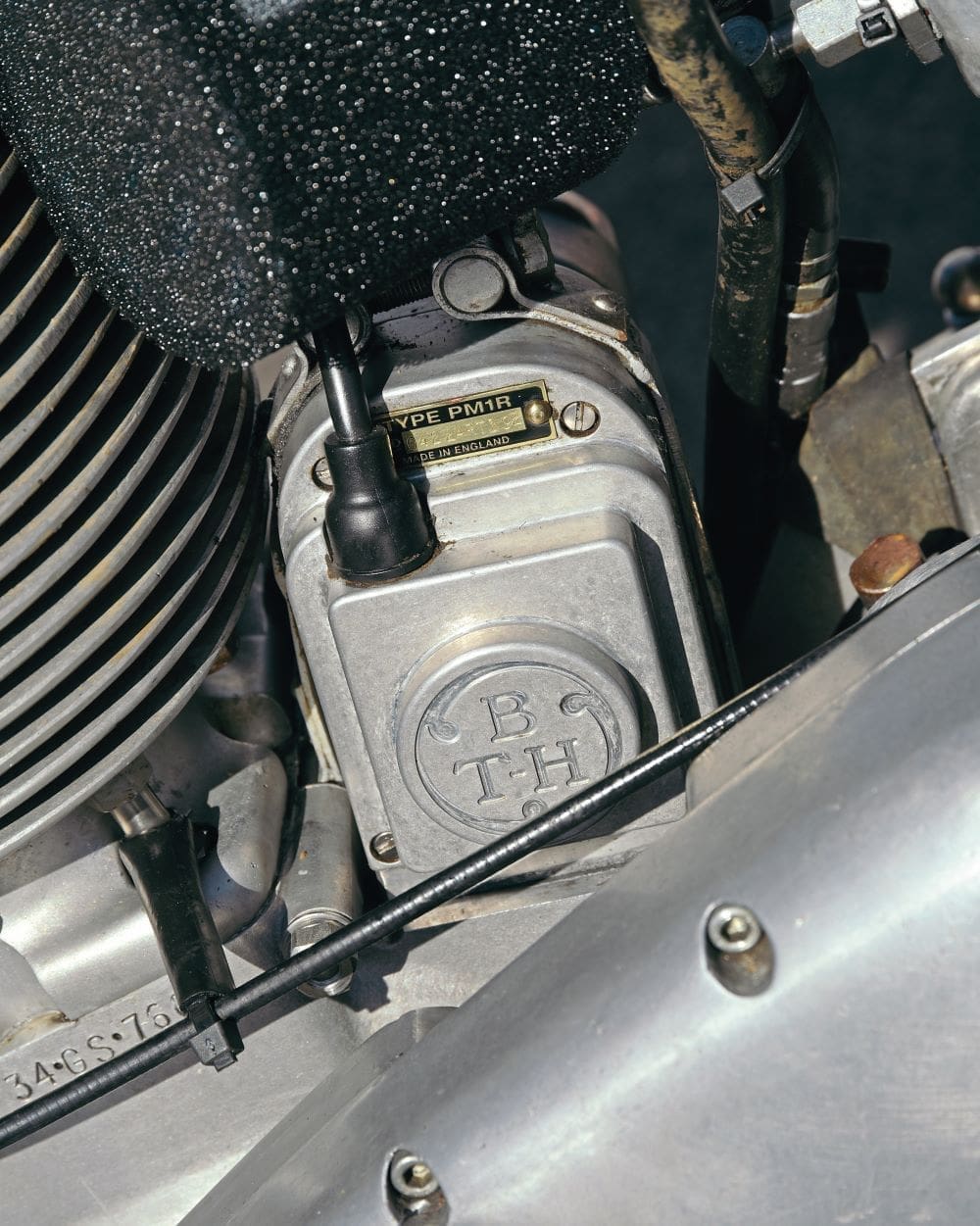 When new, the DBD Goldie scrambler our feature machine is based on was fitted with an Amal Monobloc carb which was mostly okay but under heavy use could empty the float bowl faster than the fuel flow could fill it. Available as an option was the GP carburettor which didn’t suffer fuel filling issues but needed care in assembly. A lot less fussy than the originals is Amal’s Concentric; they are available new and have a full range of spares listed. This one feeds super unleaded, with a bit of Avgas mixed in, into the engine where a spark plug fired by a BTH electronic magneto provides the bank and powers the engine.