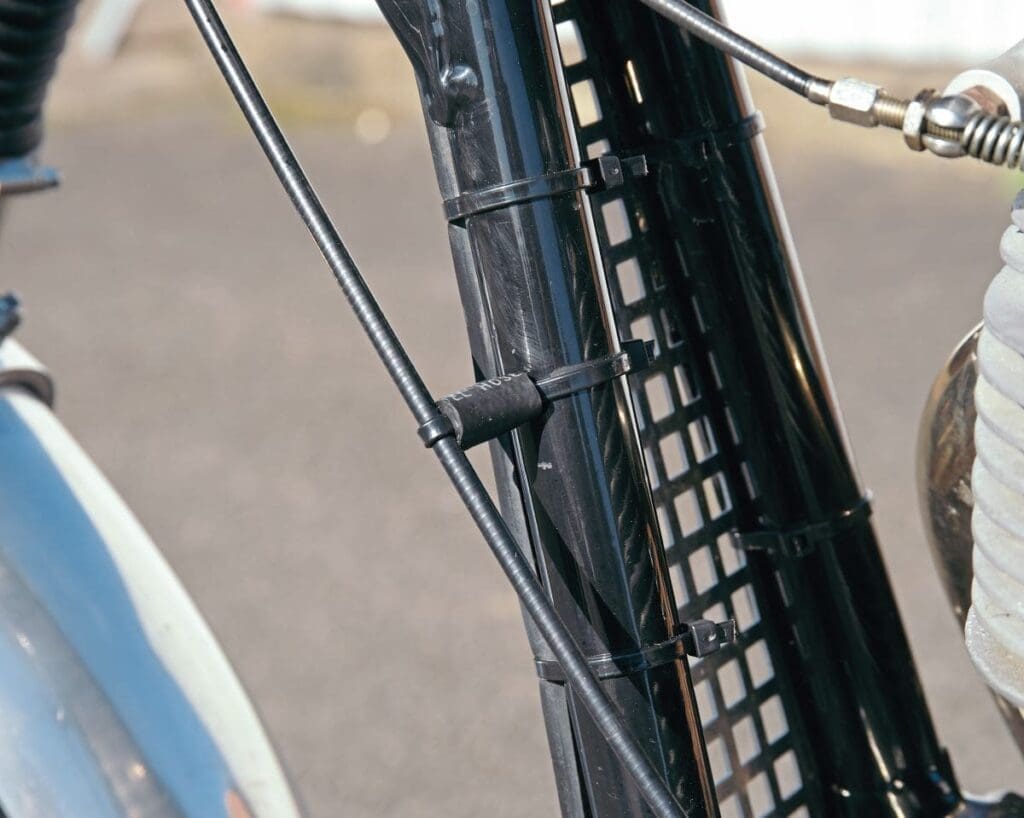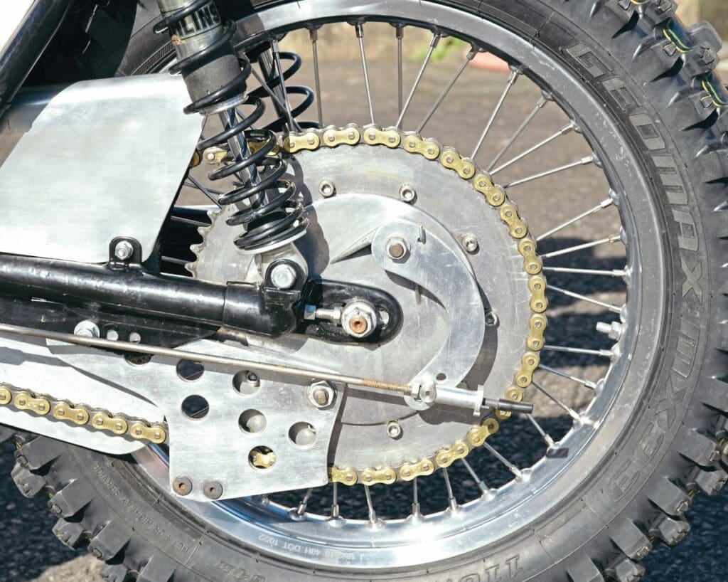 There are certain parts which have become almost compulsory when tackling a build such as this Goldie. They could be classed as fashionable but in the case of BSA’s qd ‘crinkle’ rear hub they’re popular because they work. The idea behind them is a two-part hub connected by a cog. Removal of the main spindle leaves the chain and brake equipment in place and the wheel comes out. This vastly speeds up the process in the event of a puncture, for example. There are several variations on the theme and the first one joined the range in the late Forties and it was still an option by the Seventies. Triumph used them on its 1973 ISDT machines, for example, this one on the Allen Goldie is from a B25 and has been lightened considerably. When such a hub is laced to an alloy rim it means the wheel is a lot lighter than a standard Goldie.