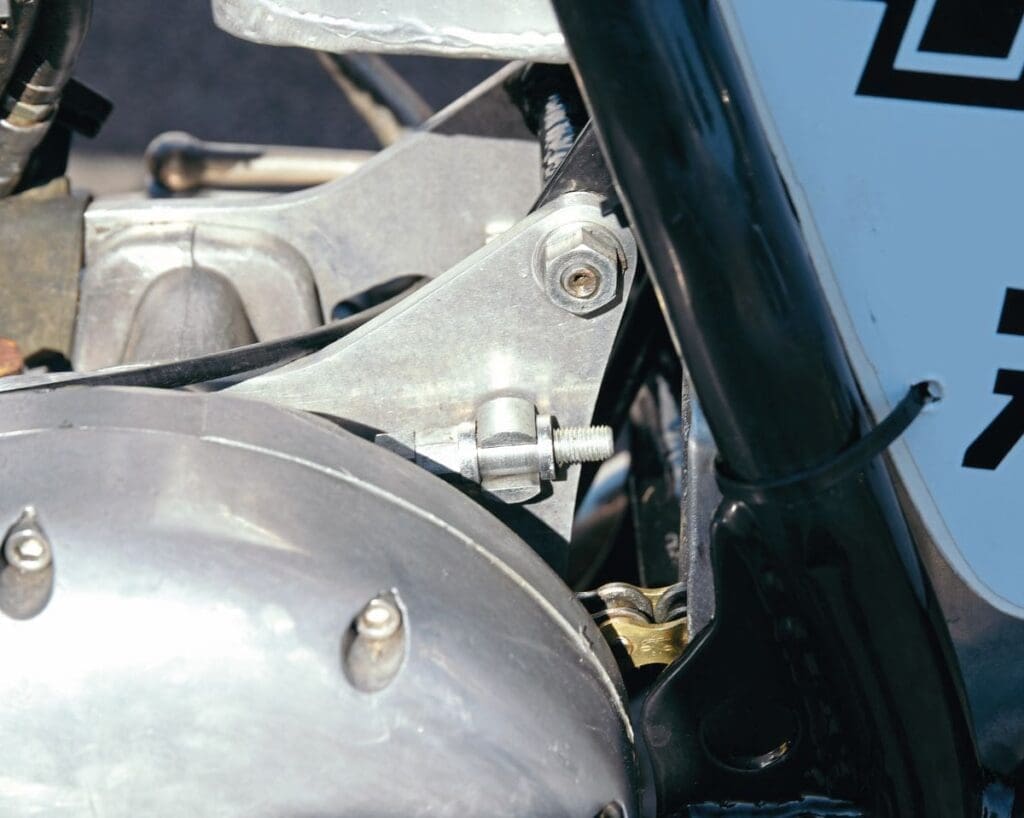As the engine and gearbox are separate entities in a Gold Star the primary case has both inner and outer components. Harold has used some old and damaged cases for the primary drive on this bike. “I don’t mind using fewer good bits and pieces and am happy to bother on and repair such things so they can be saved rather than just buy new ones.” Though to standard BSA appearance the primary cases contain something a bit more hi-tech than a single row primary chain and BSA multi-plate clutch… Inside is a belt-drive kit from Bob Newby Racing. More closely associated with road racing, Newby’s kits can also be supplied for scramblers. Says Harold: “We use a small pulley on the crankshaft and have only ever had one problem with a belt when some grit got in between it and the pulley and damaged it.” He explains this was when they were using a primary shield rather than proper cases.